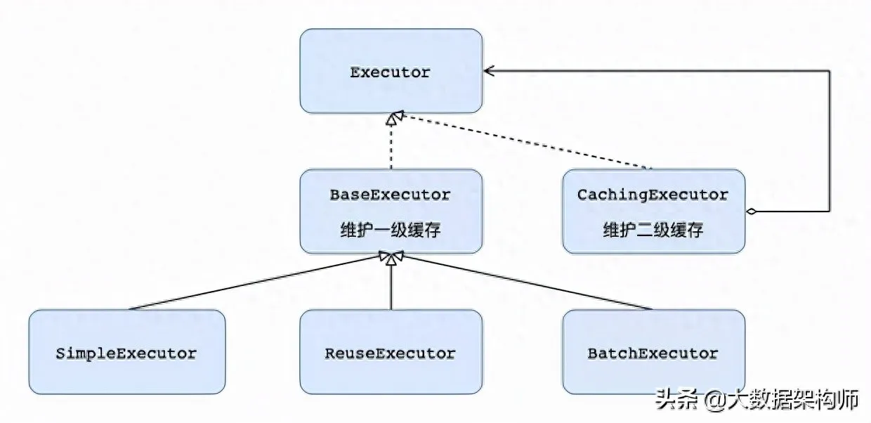 Executor的设计是一个典型的装饰者模式,SimpleExecutor,ReuseExecutor是具体实现类,而CachingExecutor是装饰器类。