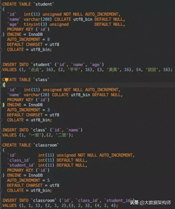 CREATE TABLE `student` ( `id` int(11) unsigned NOT NULL AUTO_INCREMENT, `name` varchar(200) COLLATE utf8_bin DEFAULT NULL, `age` tinyint(3) unsigned DEFAULT NULL, PRIMARY KEY (`id`) ) ENGINE=InnoDB AUTO_INCREMENT=4 DEFAULT CHARSET=utf8 COLLATE=utf8_bin;