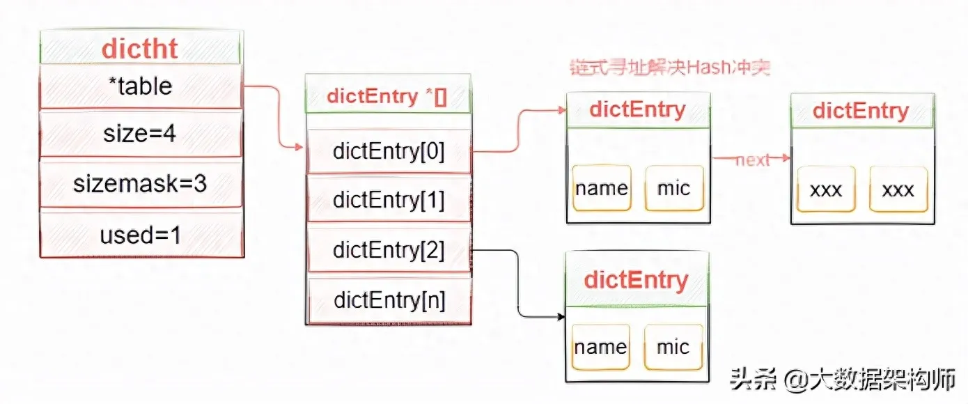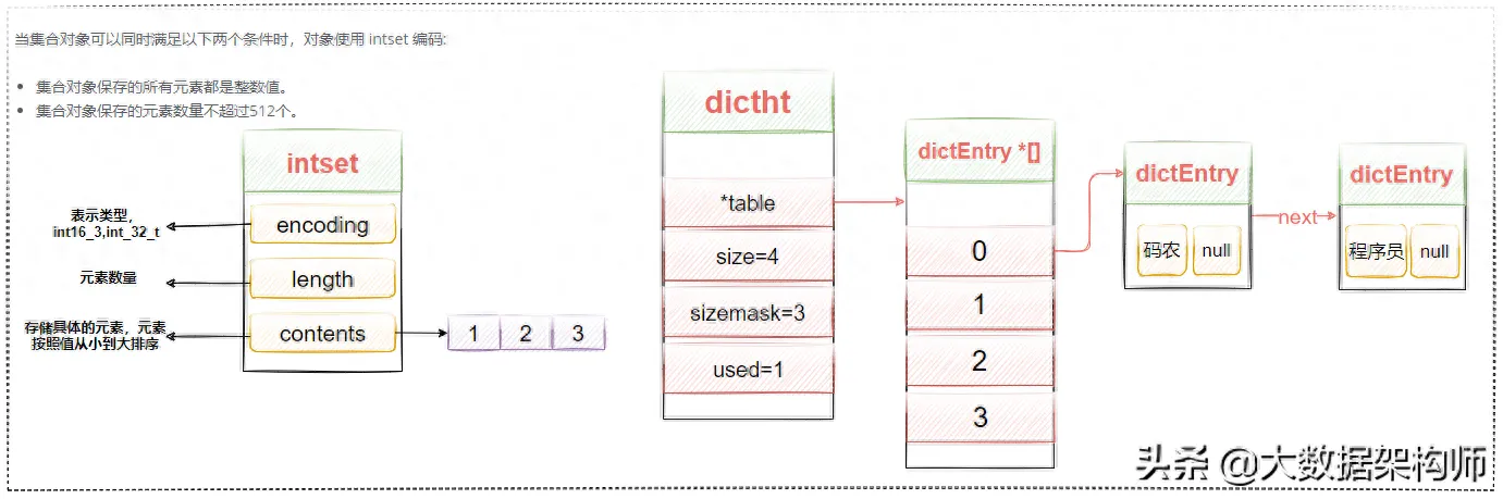 如图2-28所示,哈希类型的内部编码有两种:ziplist压缩列表,hashtable哈希表。只有当存储的数据量比较小的情况下,Redis 才使用压缩列表来实现字典类型。具体需要满足两个条件: