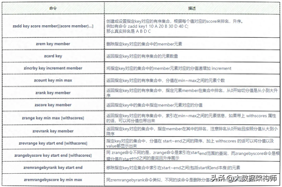 ZSet的常用命令如图2-32所示,完整的操作命令,详见:http://doc.redisfans.com/
