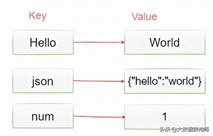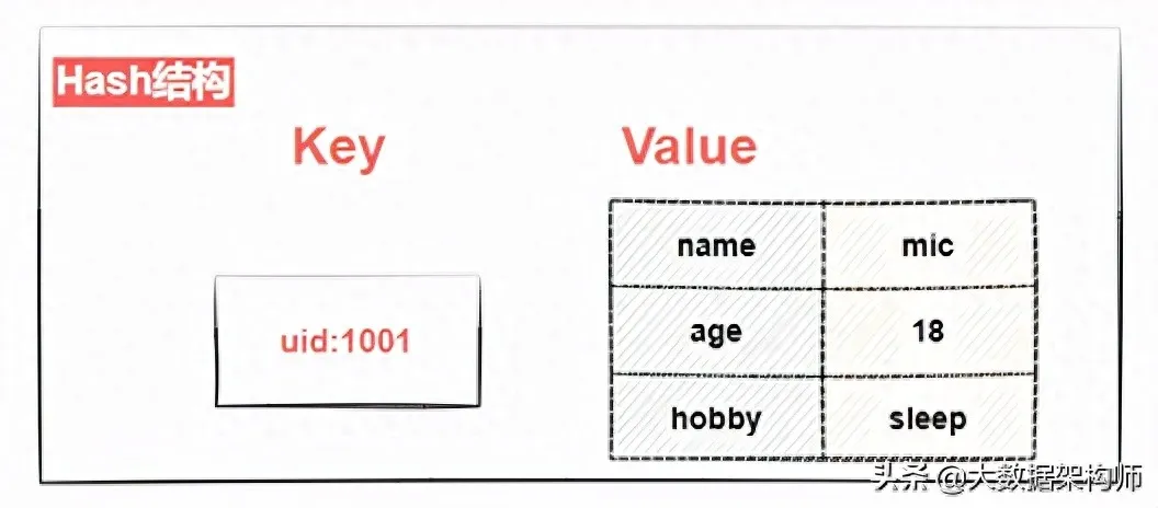 Hash类型大家应该都不陌生,他就是一个键值对集合,如图2-26所示。Hash相当于一个 string 类型的 key和 value 的映射表,key 还是key,但是value是一个键值对(key-value),类比于 Java里面的 Map<String,Map<String,Object>> 集合。