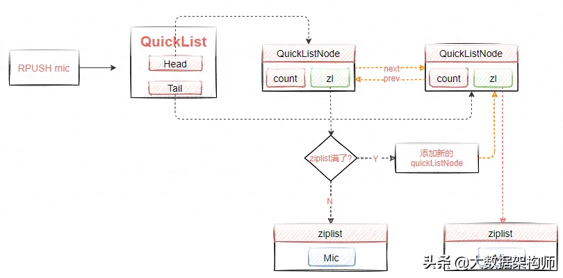 如图2-23所示,当向list中添加元素时,会直接保存到某个QuickListNode中的ziplist中,不过不管是从头部插入数据,还是从尾部插入数据,都包含两种情况