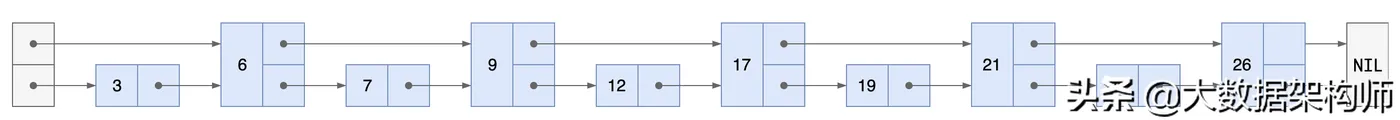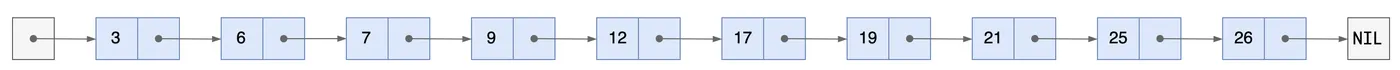 首先,跳表处理的是有序的链表(一般是双向链表,下图未表示双向),如下: