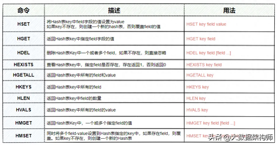 Hash结构的常用操作命令如图2-27所示,其他的指令可以参考:http://doc.redisfans.com/