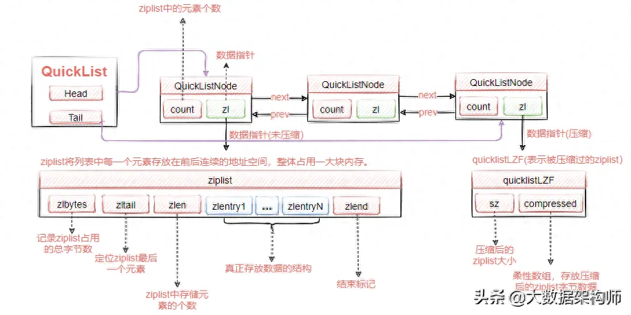 typedef struct quicklist { quicklistNode *head; //指向quicklistNode头节点 quicklistNode *tail; //指向quicklistNode的尾节点 unsigned long count; /* 所有ziplist数据项的个数综合 */ unsigned long len; /* quicklist节点个数*/ int fill : QL_FILL_BITS; /* ziplist大小设置 */ unsigned int compress : QL_COMP_BITS; /* 节点压缩深度设置 */ unsigned int bookmark_count: QL_BM_BITS; quicklistBookmark bookmarks[]; } quicklist;
