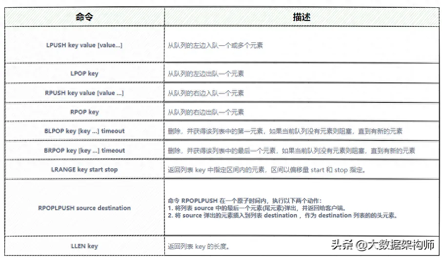 图2-21表示list类型的常用操作命令,具体命令的操作,可以参考: http://doc.redisfans.com/