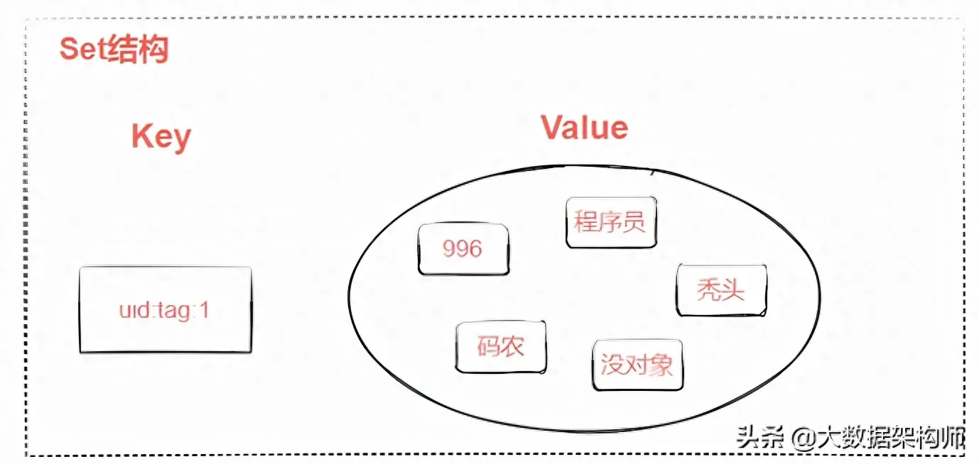 如图2-29所示,集合类型 (Set) 是一个无序并唯一的键值集合。它的存储顺序不会按照插入的先后顺序进行存储。