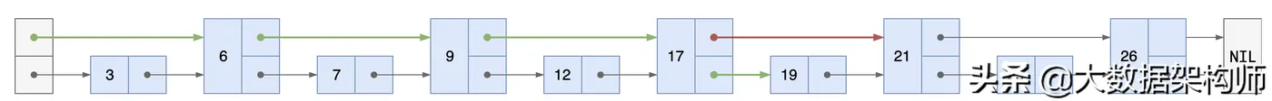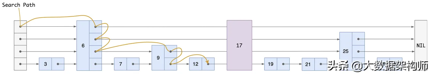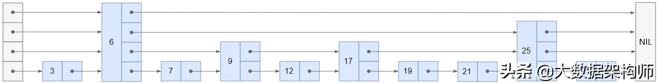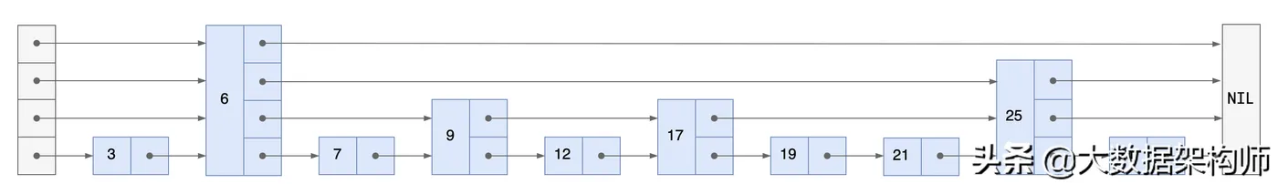 在上面的 4 层链表中搜索 25,在最上层搜索时就可以直接跳过 21 之前的所有节点,因此十分高效。