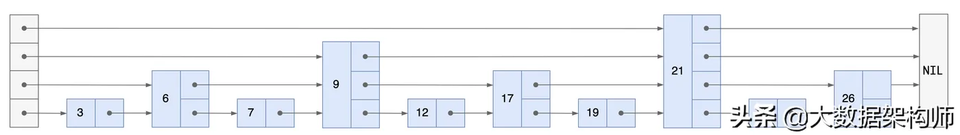 因此跳表(skip list)表示,我们就不强制要求 1:2 了,一个节点要不要被索引,建几层的索引,都在节点插入时由抛硬币决定。当然,虽然索引的节点、索引的层数是随机的,为了保证搜索的效率,要大致保证每层的节点数目与上节的结构相当。下面是一个随机生成的跳表: