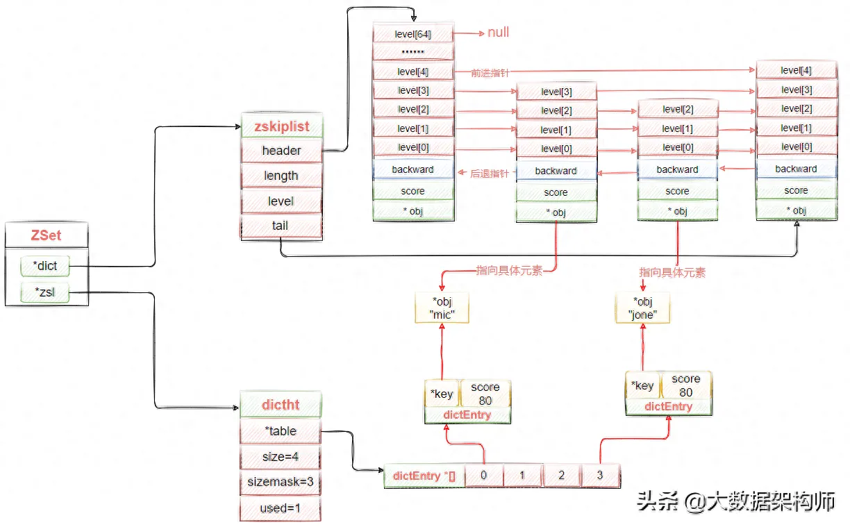 如果不能满足以上任意一个条件,有序集合会采用skiplist(跳跃表)结构进行存储,如图2-33所示,zSet不只是用skiplist,实际上,它使用了dict(字典表)和zskiplist(跳跃表)同时进行数据存储。