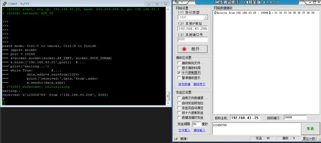 之后就可以进行ESP32和PC机之间的UDP通信了。