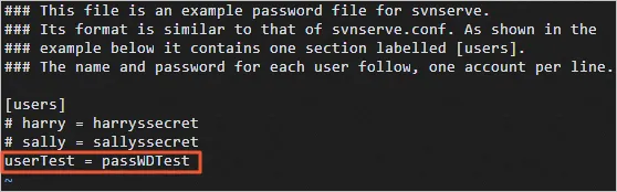 说明:添加账号和密码的格式为:账号 = 密码。例如,userTest(账号) = passWDTest(密码),如下图所示(注意等号两端要有一个空格)。
