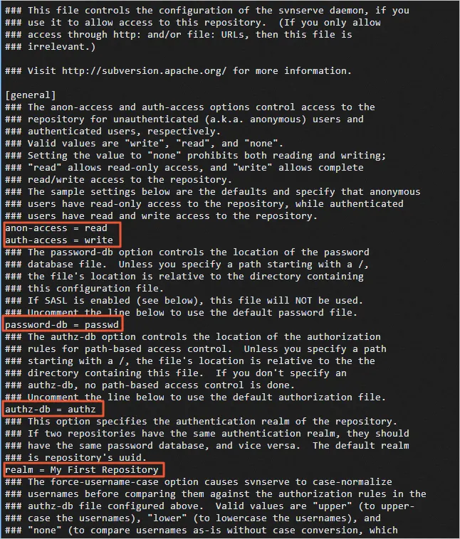 anon-access = read #匿名用户可读,您也可以设置 anon-access = none,不允许匿名用户访问。设置为 none,可以使日志日期正常显示 auth-access = write #授权用户可写 password-db = passwd #使用哪个文件作为账号文件 authz-db = authz #使用哪个文件作为权限文件 realm = /var/svn/svnrepos #认证空间名,版本库所在目录