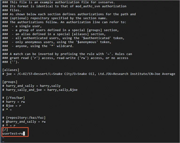 5.3 移动光标至文件末尾,并添加如下代码(其中,userTest表示账号,r表示读权限,w表示写权限)。