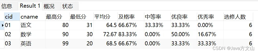 以如下形式显示:课程 ID,课程 name,最高分,最低分,平均分,及格率,中等率,优良率,优秀率及格为>=60,中等为:70-80,优良为:80-90,优秀为:>=90