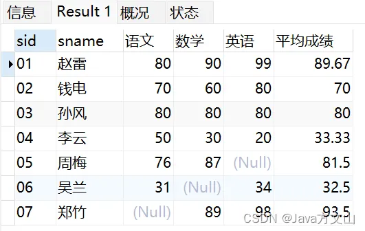 SELECT s.sid, s.sname, max( CASE WHEN sc.cid = '01' THEN sc.score END ) 语文, max( CASE WHEN sc.cid = '02' THEN sc.score END ) 数学, max( CASE WHEN sc.cid = '03' THEN sc.score END ) 英语, ROUND( AVG( sc.score ), 2 ) 平均成绩 FROM t_mysql_student s, t_mysql_score sc WHERE s.sid = sc.sid GROUP BY s.sid, s.sname ORDER BY 平均成绩 DESC