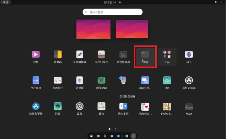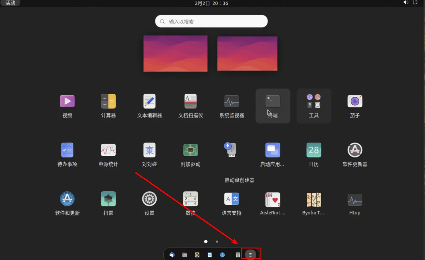 Debian包采用了UNIX中的ar标准归档命令生成,包中文件信息以及内容包经过gzip和tar打包而成,包文件扩展名为deb。如果需要安装包中的应用,可在终端中使用dpkg命令,单击屏幕下方dock中的显示更多应用程序。