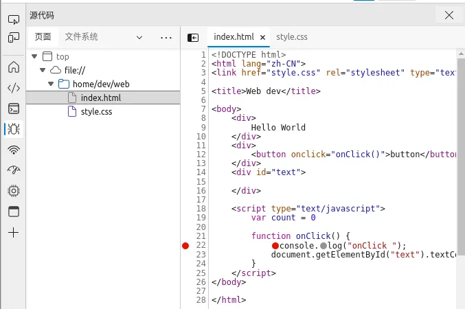 2.1 我们选择导航区的第四项 源代码 在此选项卡中,会通过文本形式为我们展示网页中已经加载的资源,我们选择index.html ,然后来我们点击右键单击index.html 的22行左侧,会在22行左侧出现一个红点,通过这种方法我们即可为JavaScrpit设置运行断点。
