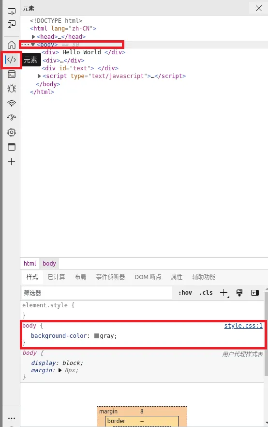 我们首先选择导航区的第二项 元素 在此选项卡中,会为我们展示网页的Dom树结构,当选择Dom树中的一个元素时,该元素对应的样式,布局等信息会显示在下方。此处我们选择 body 元素,可以发现body元素中 background-color ,display ,margin 三个样式生效,其中background-color 样式的右侧实现,该样式定义在style.css 文件中。