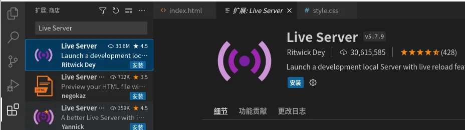 接下来在扩展管理上部输入框中输入 Live Server ,选择 Live Server 。点击 Install 安装。
