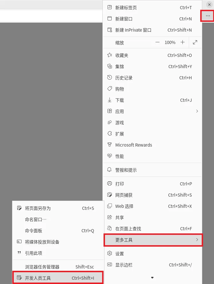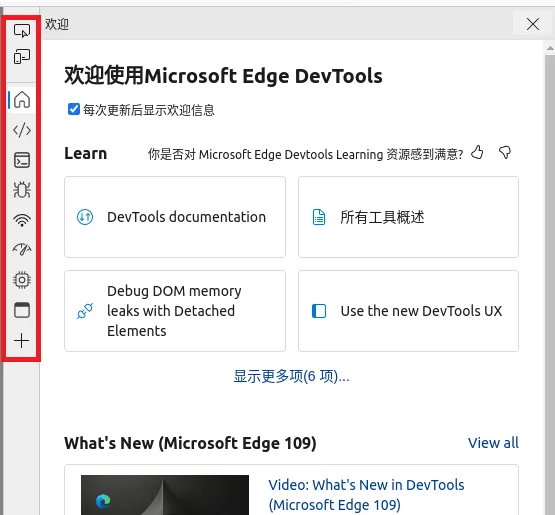 - 当我们需要调试网页的JavaScript脚本时,需要使用edge的开发者工具,我们点击浏览器右上角的按钮 设置及其他 -> 更多工具 -> 开发人员工具即可进入,在开发人员工具中界面中,左侧为功能导航区。