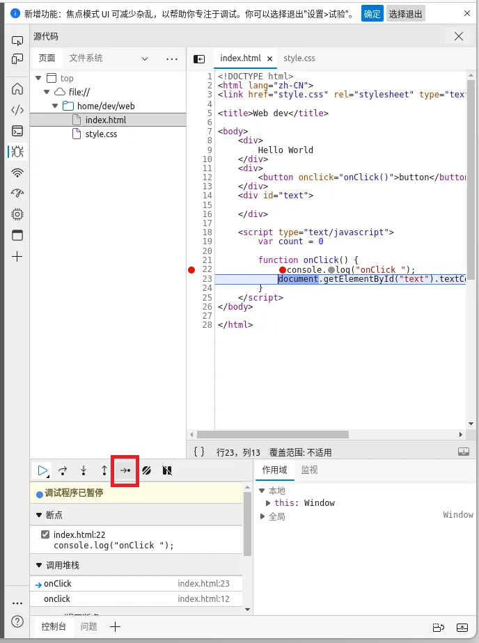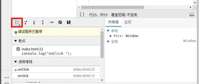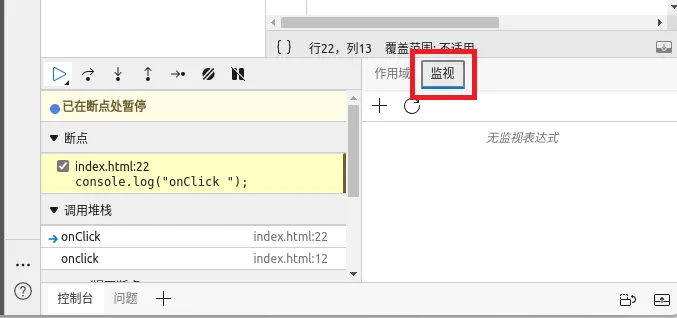 3.2 我们单击index.html:22 选项卡跳回源代码界面。然后在此单击页面中的button 按钮让程序再次进入单步调试模式。然后点击下方的监视 选项卡。