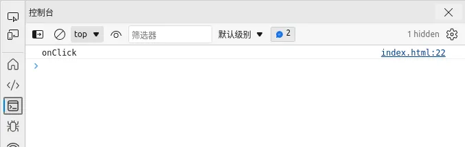 3.1 接下来我们选择导航区的第三项 控制台 在此选项卡中,会显示通过 console.log() 指令输出的调试日志。在此页面我们可以看到程序输出了一条日志,内容为onClick,console.log()的调用位置为index.html的22行。