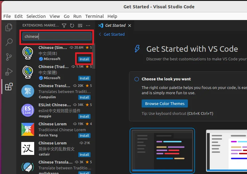 1.2 在扩展管理中我们首先安装中文语言包,在上部输入框中输入 chinese ,即可看到官方的中文语言包扩展。单击Install 进行安装。