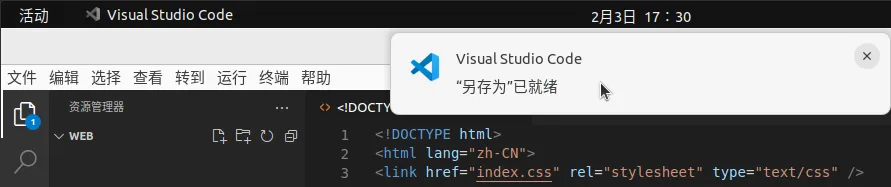 2.5 选择菜单后,vscode会弹出 "另存为"已就绪 弹窗,单击弹窗。