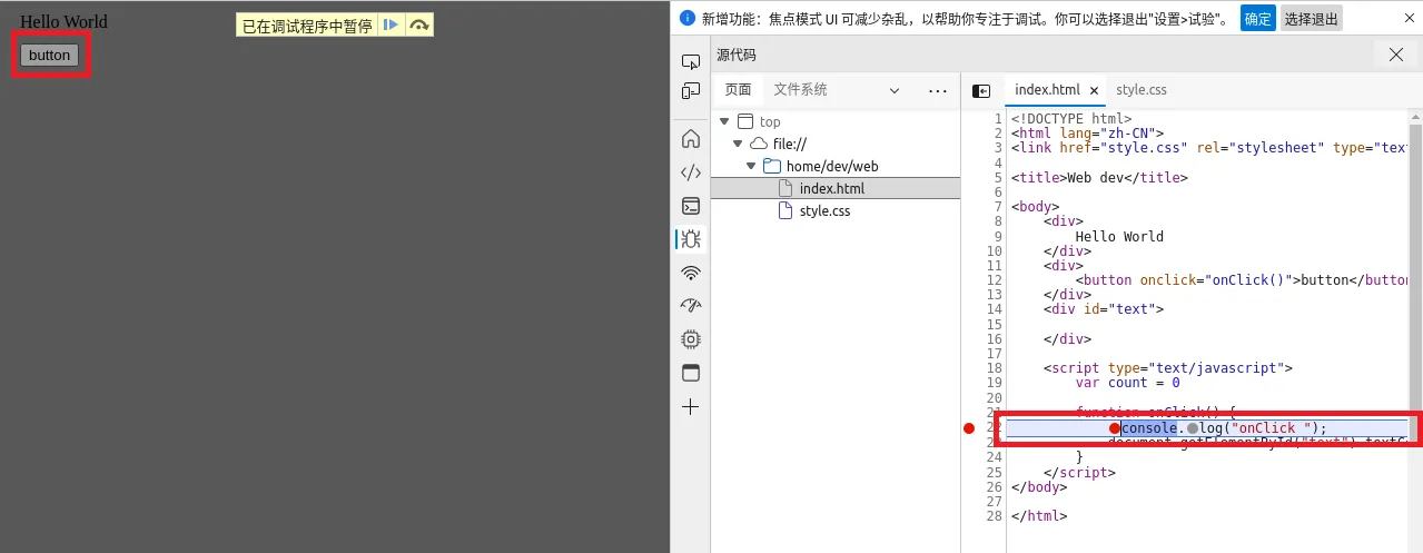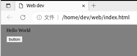 <!DOCTYPE html> <html lang="zh-CN"> <link href="style.css" rel="stylesheet" type="text/css" /> <title>Web dev</title> <body> <div> Hello World </div> <div> <button onclick="onClick()">button</button> </div> <div id="text"> </div> <script type="text/javascript"> var count = 0 function onClick() { console.log("onClick "); document.getElementById("text").textContent += ("onClink" + (count++) + " ") } </script> </body> </html>