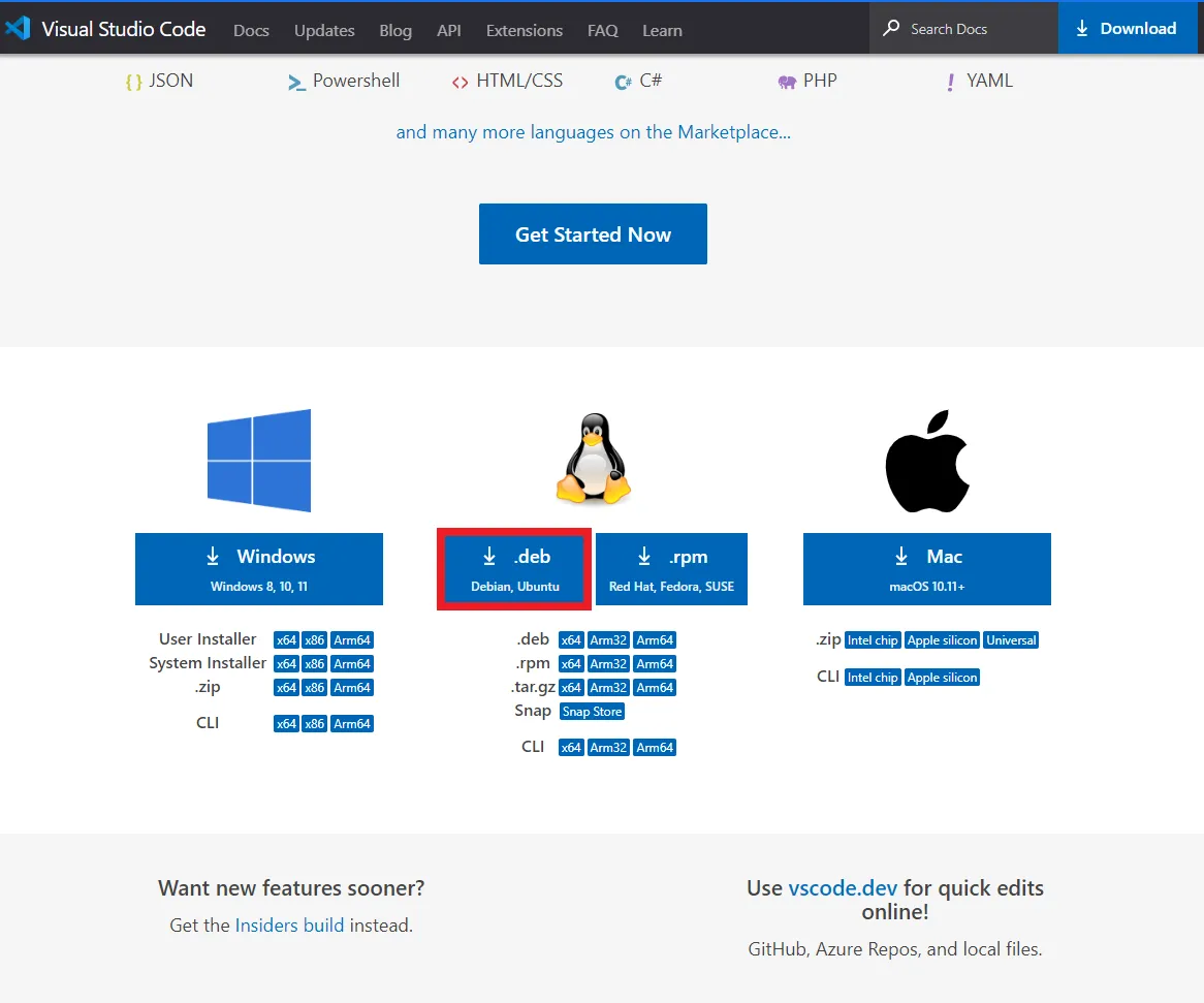 vscode 和edge做为微软提供的免费软件,均可在相应的官网下载最新的安装版本。其中vscode的下载网页地址为 https://code.visualstudio.com/#alt-downloads 在网页中选择 .deb 格式下载。
