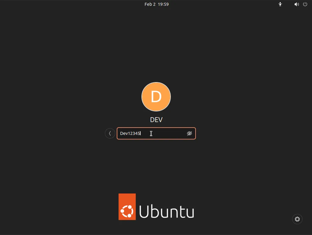 本次实验中,我们使用的镜像是以ubuntu 22.04作为基础构建,在此之上安装了ubuntu-desktop,并使用gdm3作为显示界面。在实验镜像中,已经为同学们创建了默认的登录账户dev。dev账户的登录密码为 Dev12345 。因此我们在用户列表中选择DEV,在密码框输入Dev12345并回车登录。