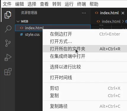 3.1 在index.html文件上点击右键,选择菜单 打开所在的文件夹 。