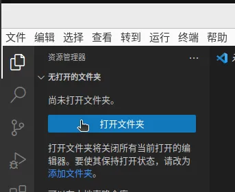 1.4 接下来打开vscode编译器,在 资源管理器 选项卡中选择 打开文件夹 。
