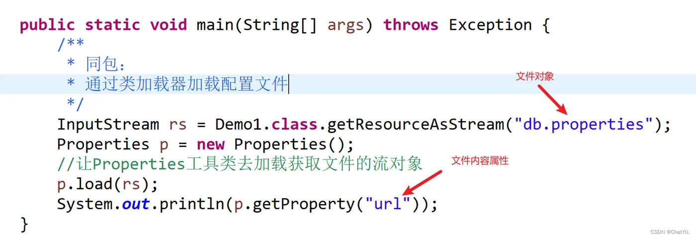 在同一个包中,我们可以直接通过加载器加载配置文件获取,并通过properties工具类去加载它的流对象