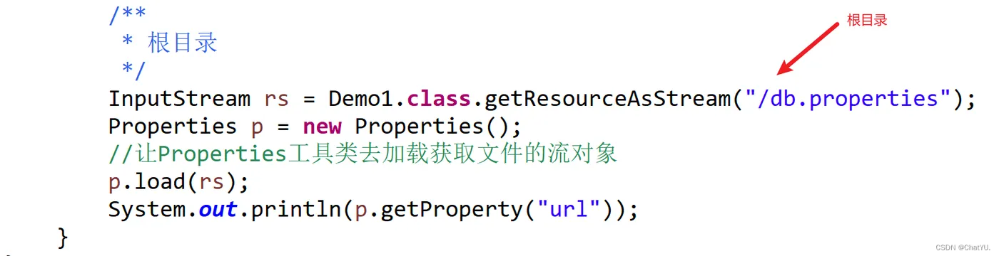 package com.YU; import java.io.IOException; import java.io.InputStream; import java.util.Properties; /** * 读取不同位置的配置文件 * 1.同包 * 2.根目录 * 3.安全路径WEB-INF * @author 21879 * */ public class Demo1 { public static void main(String[] args) throws Exception { // /** // * 同包: // * 通过类加载器加载配置文件 // */ // InputStream rs = Demo1.class.getResourceAsStream("db.properties"); // Properties p = new Properties(); // //让Properties工具类去加载获取文件的流对象 // p.load(rs); // System.out.println(p.getProperty("url")); /** * 根目录 */ InputStream rs = Demo1.class.getResourceAsStream("/db.properties"); Properties p = new Properties(); //让Properties工具类去加载获取文件的流对象 p.load(rs); System.out.println(p.getProperty("url")); } }