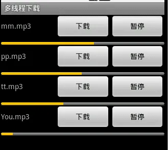 下面来看主界面的布局,在这里,我只设计了一个ListView来显示下载的音乐的名称,和一个开始下载按钮和一个暂停按钮。