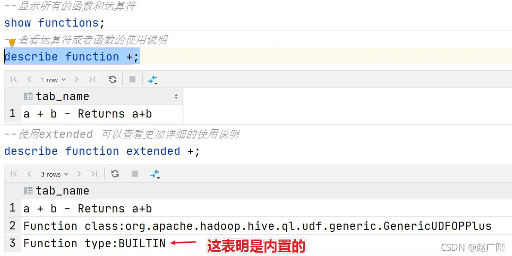 --显示所有的函数和运算符 show functions; --查看运算符或者函数的使用说明 describe function +; --使用extended 可以查看更加详细的使用说明 describe function extended +;