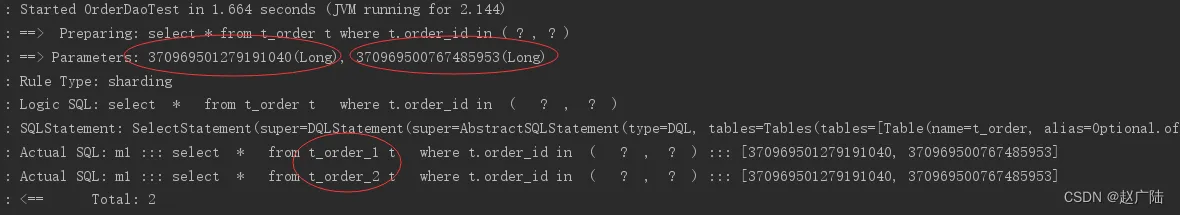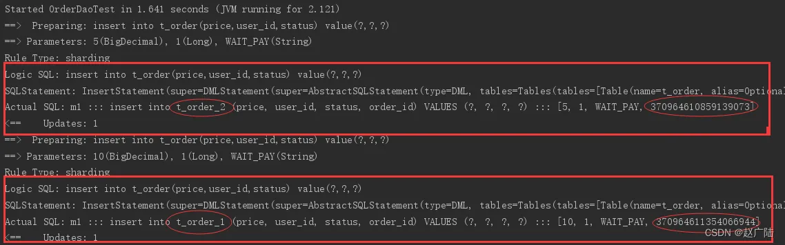 通过日志可以发现order_id为奇数的被插入到t_order_2表,为偶数的被插入到t_order_1表,达到预期目标。