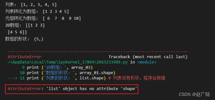 import numpy as np # 导入NumPy数学工具集 list=[1,2,3,4,5] # 创建列表 array_01=np.array([1,2,3,4,5]) # 列表转化成数组 array_02=np.array((6,7,8,9,10)) # 元组转化成数组 array_03=np.array([[1,2,3],[4,5,6]]) # 列表转化成2D数组 print ('列表:', list) print ('列表转化为数组:', array_01) print ('元组转化为数组:', array_02) print ('2D数组:', array_03) print ('数组的形状:', array_01.shape) # print ('列表的形状:', list.shape) # 列表没有形状,程序会报错