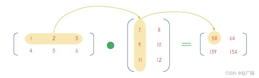 矩阵和矩阵之间的点积,大家就只需要牢记一个原则:第一个矩阵的第1阶,一定要和第二个矩阵的第0阶维度相同。即,形状为(a,b)和(b,c)的两个张量中相同的b维度值,是矩阵点积实现的关键,其点积结果矩阵的形状为(a,c)。