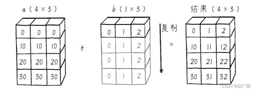 then通过广播将值为1的维度进行“复制”(也形象地称为“拉伸”)后, 进行算术操作;