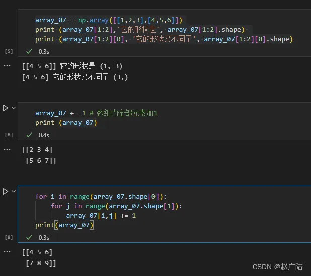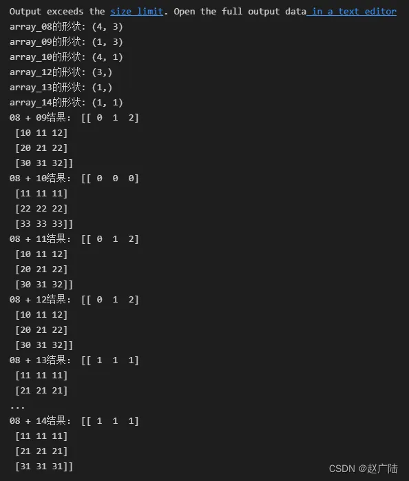 array_08 = np.array([[0,0,0], [10,10,10], [20,20,20], [30,30,30]]) array_09 = np.array([[0,1,2]]) array_10 = np.array([[0],[1],[2],[3]]) list_11 = [[0,1,2]] print ('array_08的形状:', array_08.shape) print ('array_09的形状:', array_09.shape) print ('array_10的形状:', array_10.shape) array_12 = array_09.reshape(3) print ('array_12的形状:', array_12.shape) array_13 = np.array([1]) print ('array_13的形状:', array_13.shape) array_14 = array_13.reshape(1,1) print ('array_14的形状:', array_14.shape) print ('08 + 09结果:',array_08 + array_09) print ('08 + 10结果:',array_08 + array_10) print ('08 + 11结果:',array_08 + list_11) print ('08 + 12结果:',array_08 + array_12) print ('08 + 13结果:',array_08 + array_13) print ('08 + 14结果:',array_08 + array_14)