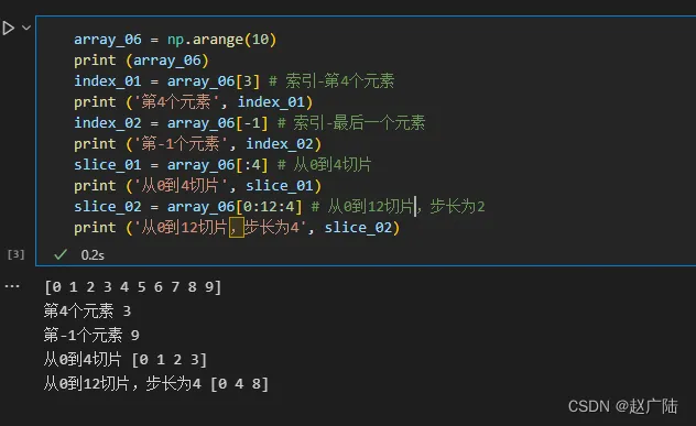 array_06 = np.arange(10) print (array_06) index_01 = array_06[3] # 索引-第4个元素 print ('第4个元素', index_01) index_02 = array_06[-1] # 索引-最后一个元素 print ('第-1个元素', index_02) slice_01 = array_06[:4] # 从0到4切片 print ('从0到4切片', slice_01) slice_02 = array_06[0:12:4] # 从0到12切片,步长为2 print ('从0到12切片,步长为4', slice_02)