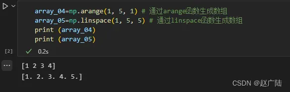 array_04=np.arange(1, 5, 1) # 通过arange函数生成数组 array_05=np.linspace(1, 5, 5) # 通过linspace函数生成数组 print (array_04) print (array_05)