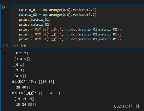 matrix_01 = np.arange(0,6).reshape(2,3) matrix_02 = np.arange(0,6).reshape(3,2) print(matrix_01) print(matrix_02) print ('01和02的点积:', np.dot(matrix_01,matrix_02)) print ('02和01的点积:', np.dot(matrix_02,matrix_01)) print ('01和01的点积:', np.dot(matrix_01,matrix_01))