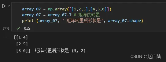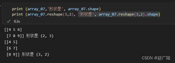 调用reshape方法时,变形只是暂时的,调用结束后,张量本身并无改变。如果要彻底地改变张量的形状需要赋值操作array_07 = array_07.reshape(3,2) #进行赋值才能改变数组本身