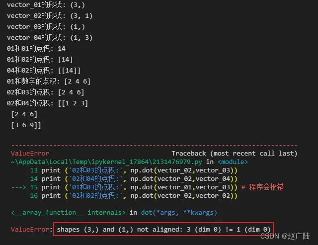 vector_01 = np.array([1,2,3]) vector_02 = np.array([[1],[2],[3]]) vector_03 = np.array([2]) vector_04 = vector_02.reshape(1,3) print ('vector_01的形状:', vector_01.shape) print ('vector_02的形状:', vector_02.shape) print ('vector_03的形状:', vector_03.shape) print ('vector_04的形状:', vector_04.shape) print ('01和01的点积:', np.dot(vector_01,vector_01)) print ('01和02的点积:', np.dot(vector_01,vector_02)) print ('04和02的点积:', np.dot(vector_04,vector_02)) print ('01和数字的点积:', np.dot(vector_01,2)) print ('02和03的点积:', np.dot(vector_02,vector_03)) print ('02和04的点积:', np.dot(vector_02,vector_04)) # print ('01和03的点积:', np.dot(vector_01,vector_03)) # 程序会报错 # print ('02和02的点积:', np.dot(vector_02,vector_02))