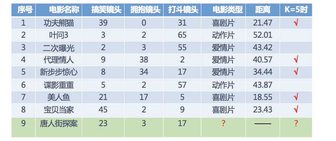其中? 9号电影不知道类别,如何去预测?我们可以利用K近邻算法的思想