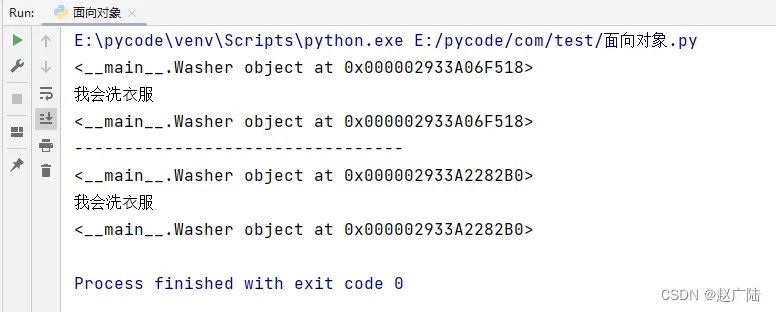 # 1. 定义类 class Washer(): def wash(self): print('我会洗⾐服') print(self) haier1 = Washer() print(haier1) # haier1对象调用实例方法 haier1.wash() haier2 = Washer() print(haier2)